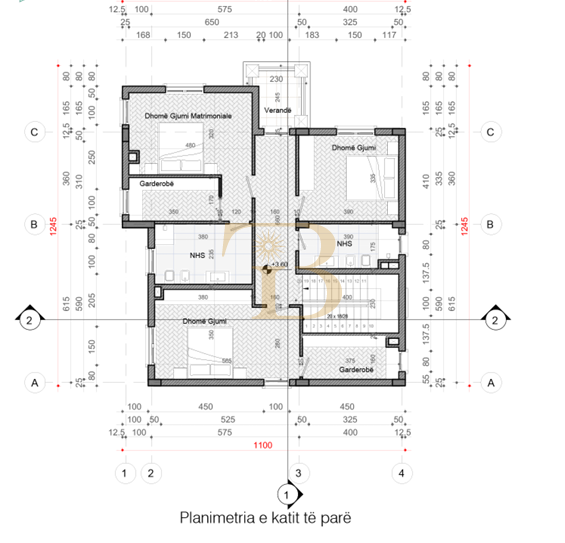 - Kati i 1 (112.59 m2): Dhome Gjumi + Garderobe + Tualet; 2 Dhoma Gjumi,Tualet, Garderobe, Veranda